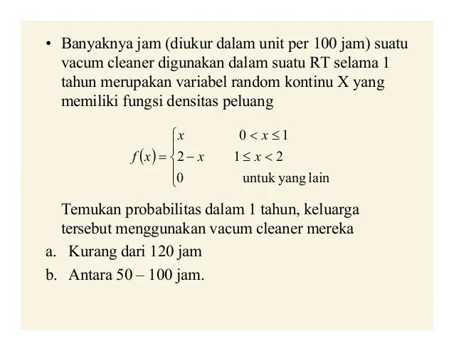 Halo adik adik berikut ini 25 butir soal himpunan kelas. Karena nilai n berukuran besar dan p mendekati 12 maka distribusi binomial dapat dihampiri oleh distribusi normal dengan u np 20004 80 dan s 2 npq 2000406 48. Misalnya fungsi peluang dari peubah acak x berbentuk. Variabel acak dapat diklasifikasikan ke dalam variabel acak diskrit dan variabel acak kontinu. Distribusi poisson adalah distribusi nilai nilai bagi suatu variabel random x x diskrit yaitu banyaknya hasil percobaan yang terjadi dalam suatu interval waktu tertentu atau disuatu daerah tertentu. Variabel acak x menyatakan banyak soal yang dikerjakan dengan benar. Contoh soal matematika diskrit dan logika beserta jawaban soal dan pembahasan variabel acak diskrit, 05 03 2019 variabel diskrit merupakan variable yang nilainya dapat diperoleh dengan cara membilang ataupun menghitung variable dari sampel yang diambil dari populasi ini bertujuan untuk mempermudah pemahaman teori sampel dan pembahasan hipotesis. Untuk sebuah bola putih yang terambil, kamu akan mendapatkan $1. Oleh karena itu y merupakan variabel acak kontinu. Biasanya variabel acak dinyatakan ruang sampel diskrit mempunyai banyak elemen terhingga eksperimen : Modul kuliah statistika 1 wordpress com mafiadoc com. Umumnya variabel diskrit berhubungan dengan pencacahan terhadap suatu objek atau indvidu. Contoh soal variabel acak diskrit dan kontinu.