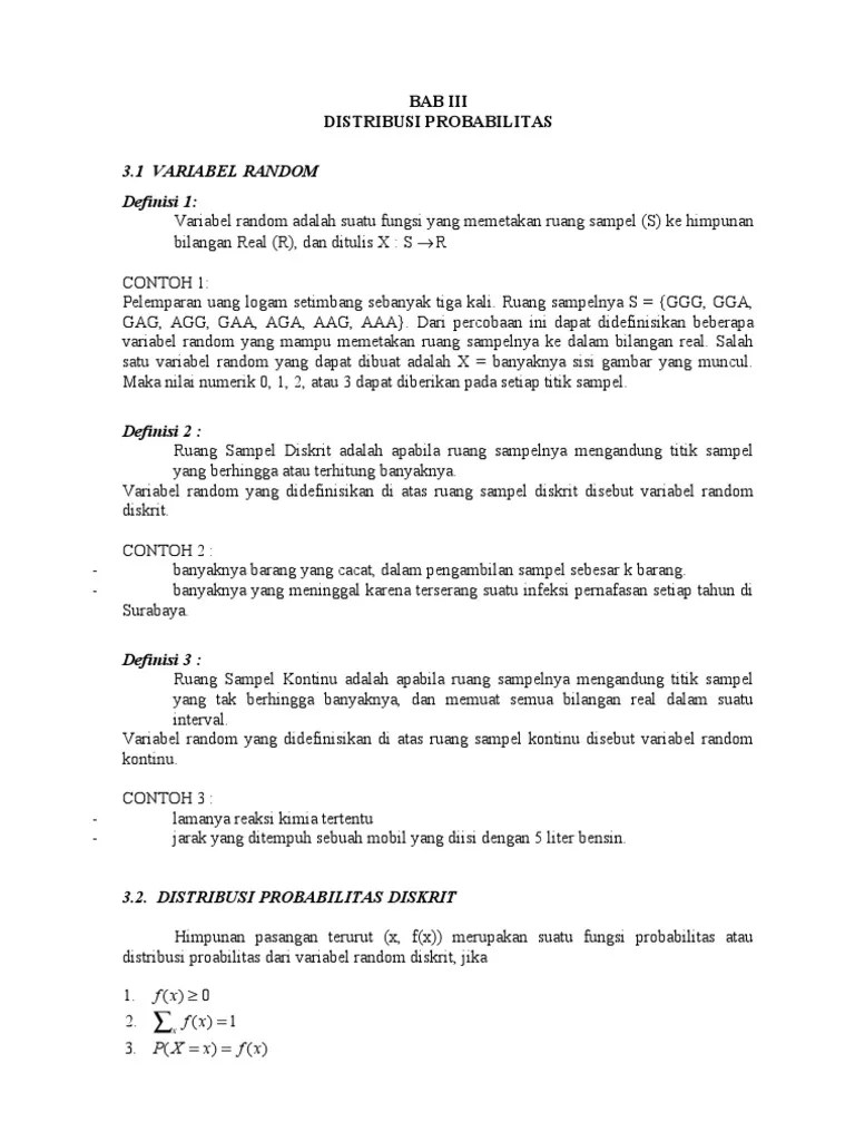 Distribusi peluang adalah tabel gambar atau persamaan yang menggambarkan atau mendeskripsikan nilai nilai yang mungkin dari peubah acak dan peluang yang bersesuaiannya peubah acak diskrit atau kepadatan peubah acak kontinu. Biasanya variabel acak dinyatakan ruang sampel diskrit mempunyai banyak elemen terhingga eksperimen : June 20, 2021 by admin. Suatu variabel acak kontinu berkaitan dengan fungsi kepadatan peluang. Sari mengerjakan 4 buah soal.